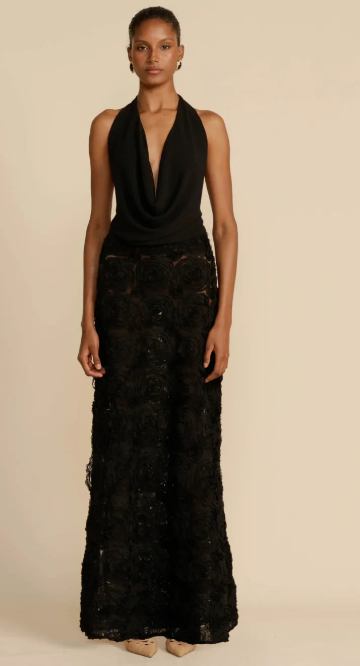 Meet Adriana, a sensually timeless maxi inspired by vintage romance. Fashioned from a luxurious rose applique, beautifully contrasted with flowing georgette that drapes over your bodice. Adriana was designed with focus to flatter the feminine curves. She features a plunging cowl neckline and drop waist that cascades into a full-length A-line skirt. A captivating low back, coupled with an adjustable back strap cinches the waist to achieve the perfect fit. Adriana is an enduring classic, made to be cherished for seasons to come.