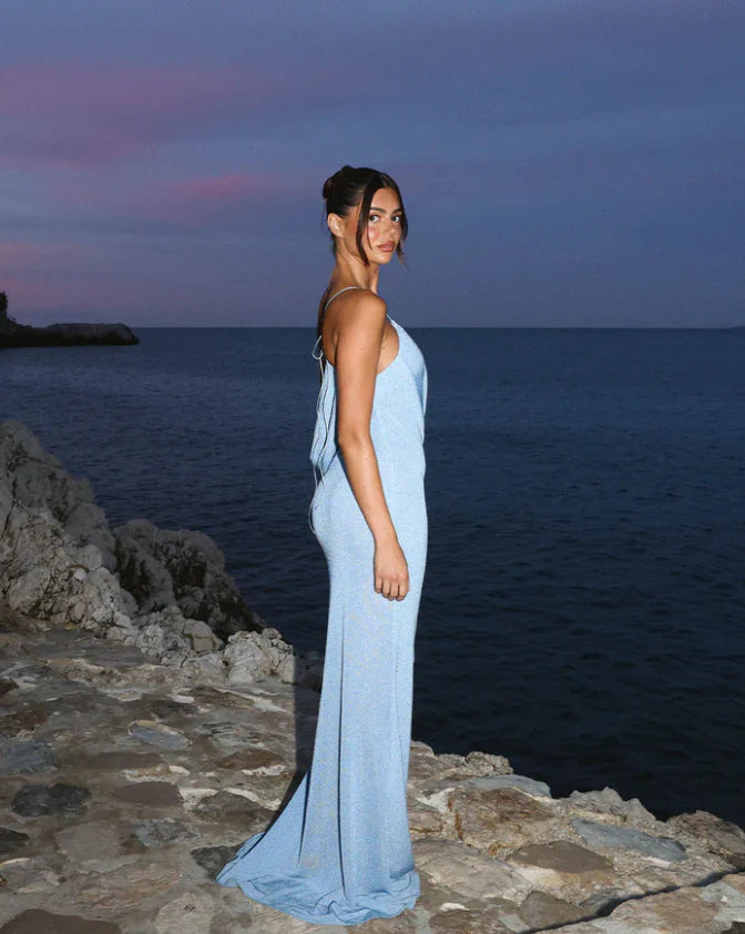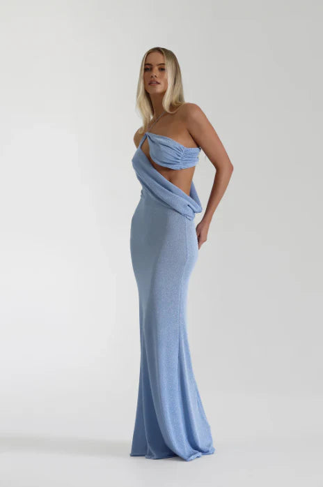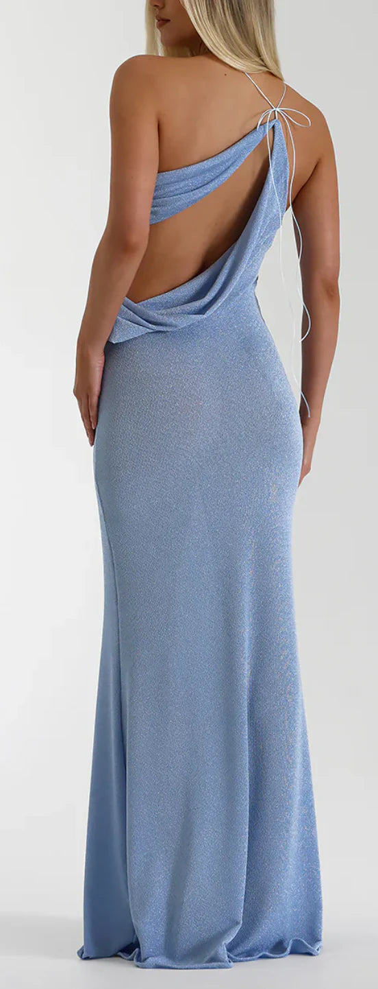 A naturally flowing silhouette, the Elissa Dress drapes elegantly over the body, pooling at the hip to accentuate the feminine form. An asymmetrical cut away adds a touch of daring, complimented by a full length skirt for a sophisticated edge. Adjustable cords and a slinky, stretch knit fabrication allow ease in wear. Elissa's allure is complete with lustrous finish, reflected through interwoven metallic thread.