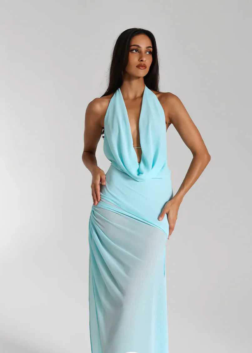 The mini with multiple personas, Anastasia can be worn with a shorter hemline or embraced at her full-length alter ego. Soft Georgette drapes fluidly from a halter neckline, falling into a deep cowl front. Adjustable cord tie sits underneath the bust to secure the drape to the bodice and support an exaggerated open back. Considered in wearability, Anastasia's self-lined front and wrapped back feature create playful coverage.