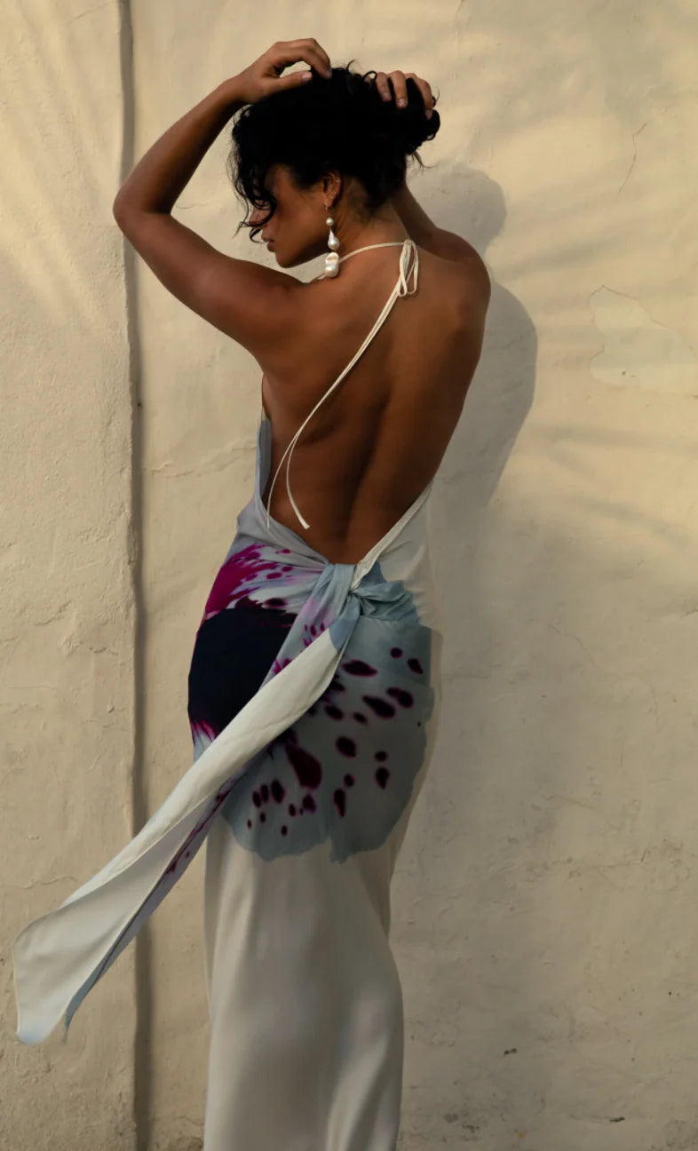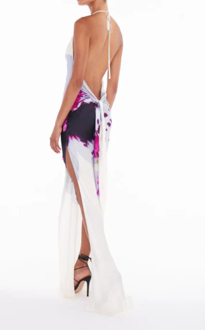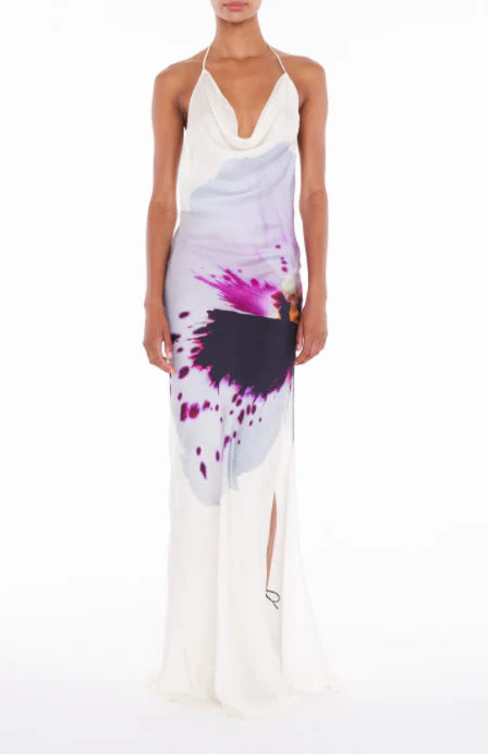 With an enduring beauty that's impossible to resist, the Angelina dress is a timeless wardrobe icon made to be loved for a lifetime. With a flawless, fluid silhouette that sweeps gracefully to the floor and skims the body with the utmost chic, it's crafted from a luxurious, beautifully draping satin and printed with an oversized iris in romantic tones of purple. The daringly cut back is finished with knotted sash detailing and delicate ties while the gently plunging cowl and slit skirt perfectly balance elegant sophistication with an air of seduction.