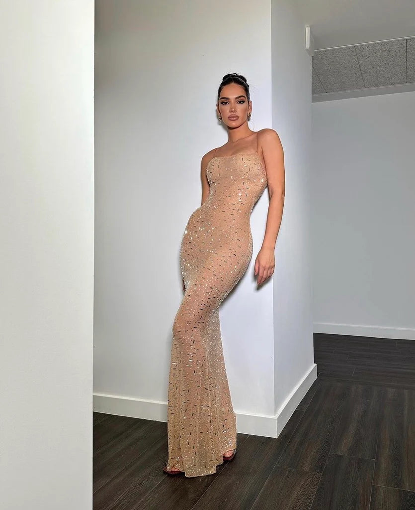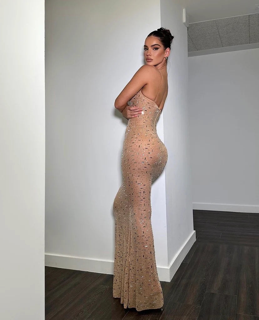 Glittering evenings. A premium design crafted by our team of in-house ateliers, Antonella is an effortlessly glamorous gown cut from sheer, stretch mesh fabric and hand embellished with delicate artisanal crystal hotfix. Complete with a soft scoop neckline and delicate shoulder straps.