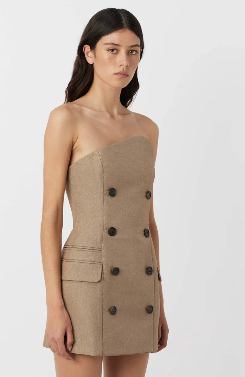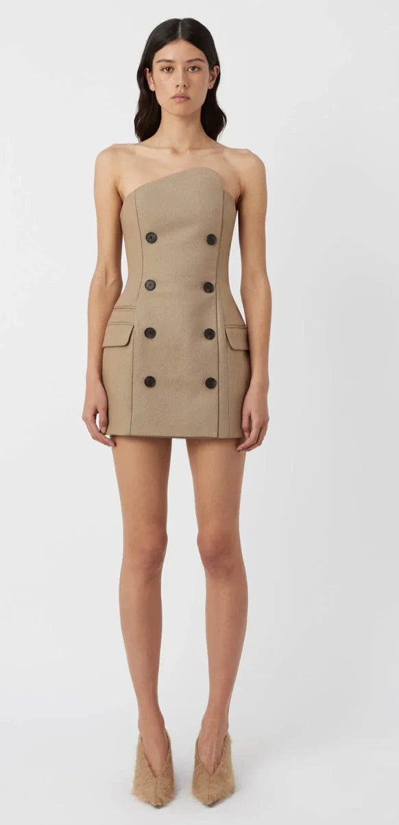 The Asteria Dress is a playful fusion of timeless style and contemporary allure. Tailored with an hourglass silhouette this dress effortlessly captures the essence of modern glamour for a slim and flattering fit. Adorned with jet welt pockets and a mock double-breasted closure the Asteria Dress is a striking choice for those who appreciate both precision and panache in their wardrobe.
