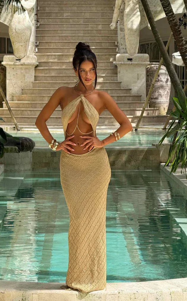 The Bel Maxi Dress is crafted from a gold lurex knit that catches the eye. The halter neckline loops through a fine gold choker, creating two sculpted panels that drape open through the bust. A delicate chain curves beneath the bust, connecting at each side and floating just above the waist like body jewellery. The back ties up with a soft string closure, keeping the fit adjustable and open. It’s fully lined in mesh for a semi-sheer look that hugs the body.