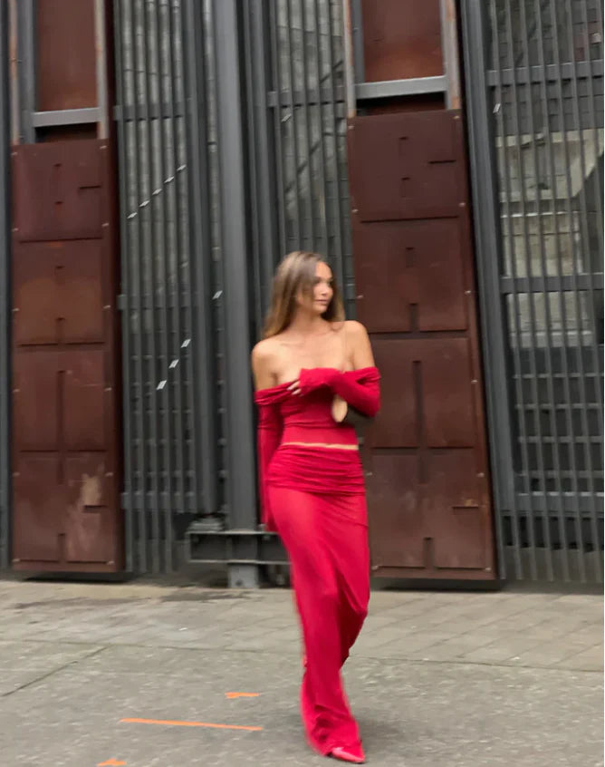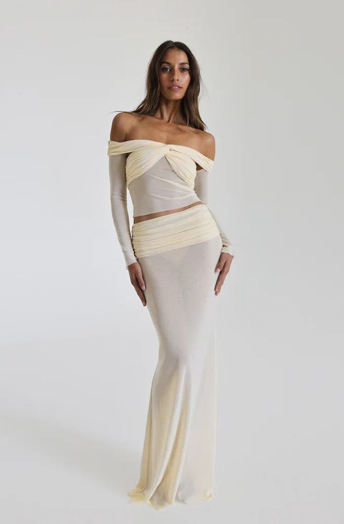 A longline crop with notions of romance, Charlotte flirts with the sheerness of soft-stretch mesh. Thoughtful ruching offers playful coverage across the bust, with centre-twist detail connecting to off-shoulder draping. Lightweight and fitted, long sleeves add effortless elegance. Wear the Charlotte Crop with her intended counterpart, the Charlotte Skirt, or elevate your outfitting and style for versatility.