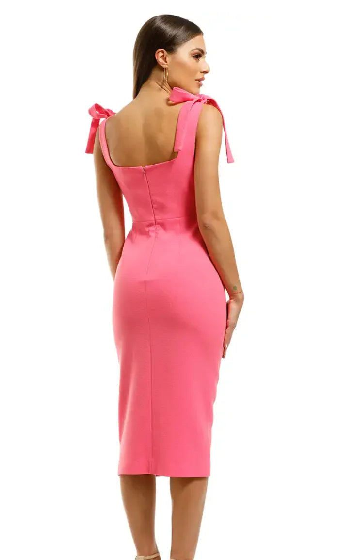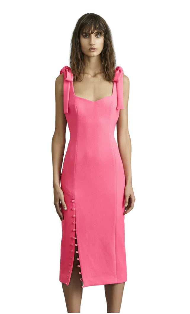 Crafted from beautifully textured crepe in neon pink, this contemporary, sophisticated midi dress is both edgy and playful. With a structured bodice and chic front split with button detail, you’ll be the center of attention in this sexy silhouette. With a demure v neckline and shoulder bow tie detail, this dress is quintessentially feminine and will be perfect to rent this summer for a cocktail party or a
