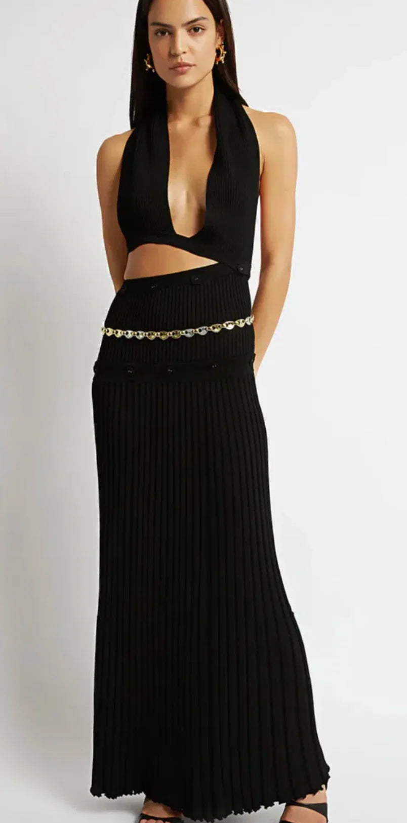 The Deconstruct Backless Halter Dress can be worn several ways, with buttons that run diagonally across the torso and skirt. It can be worn with a few buttons undone to create cut outs or worn as a halter top and skirt.