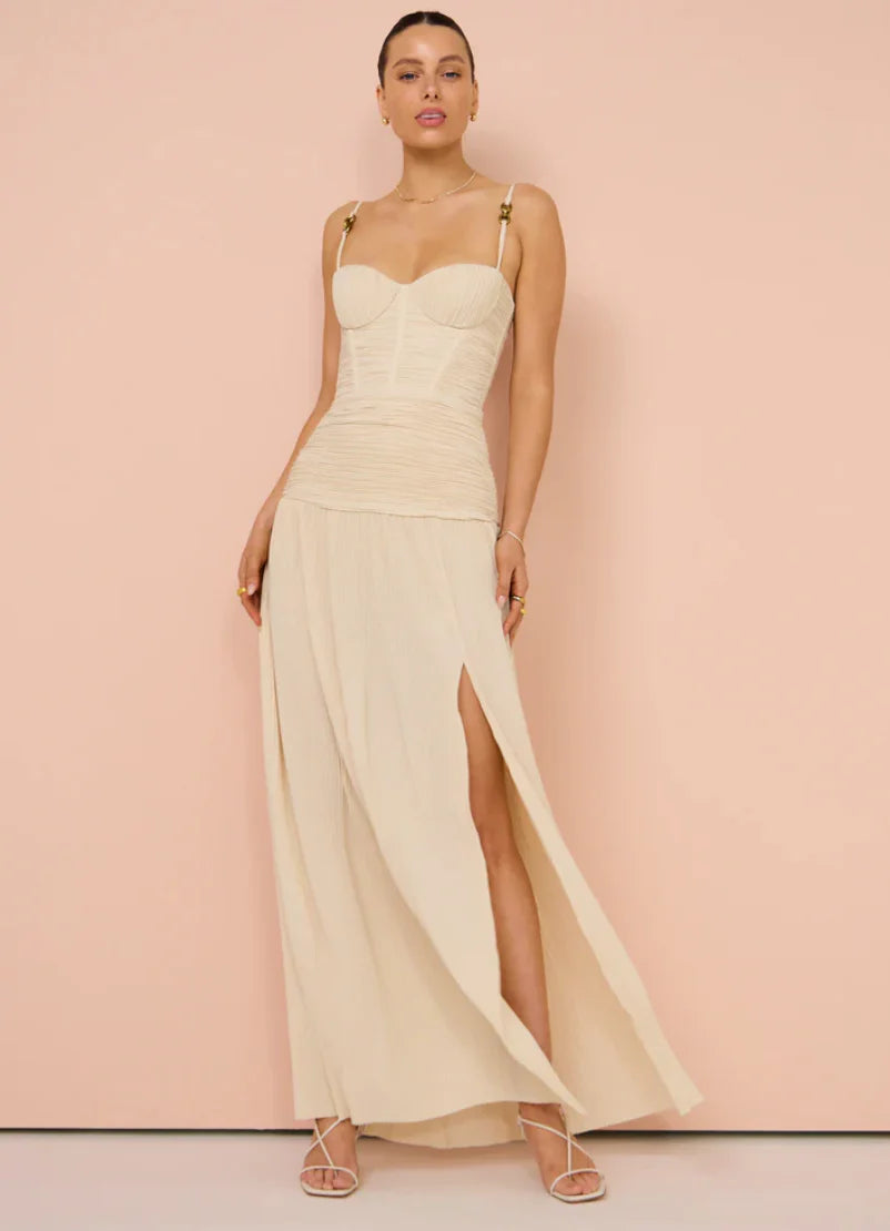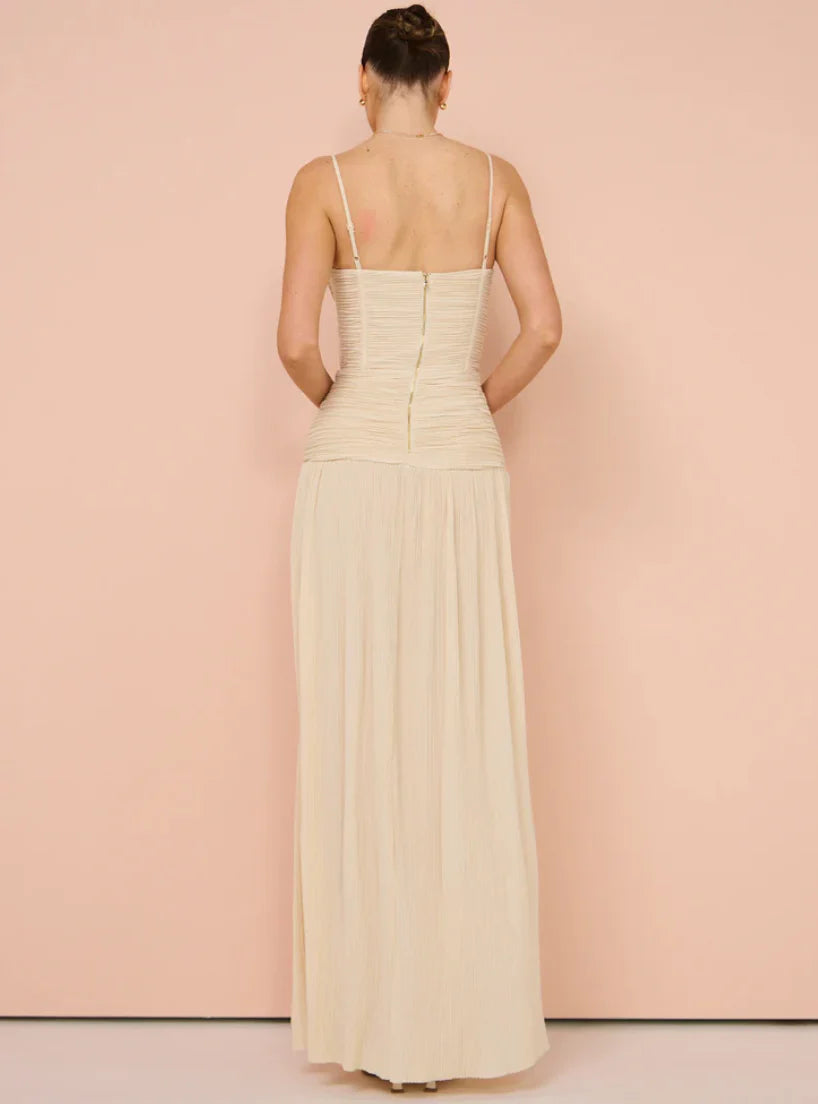 Discover the show-stopping elegance of Double Time Pleat Dress in Nougat.