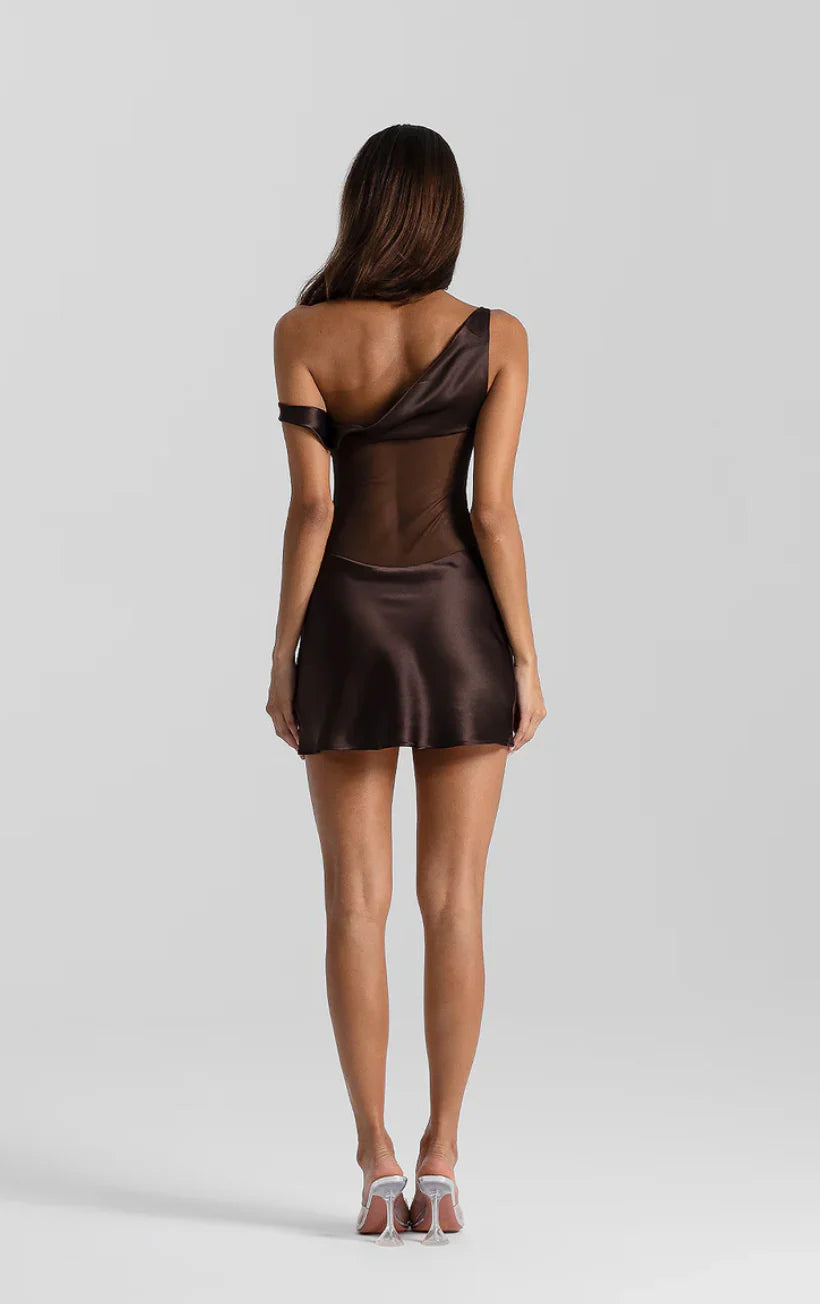 Defined by signature silk draping and her sculpted sheer contrast, Elodie is a mini dress for the contemporary minded.
