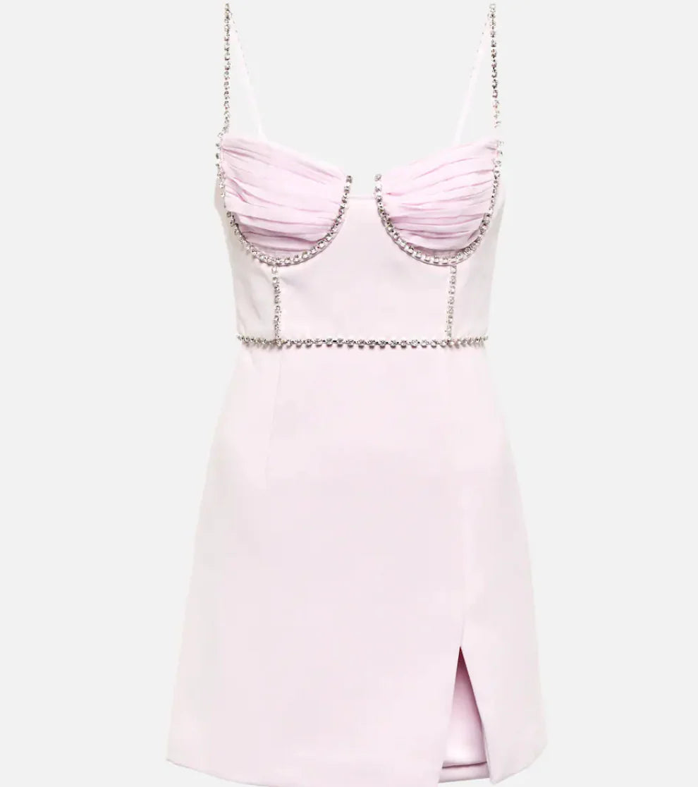 Turn heads in this crêpe minidress from Self-Portrait. It features ruched chiffon inserts at the bust, a side-slit at the hem, and is trimmed with glamorous crystal embellishments.