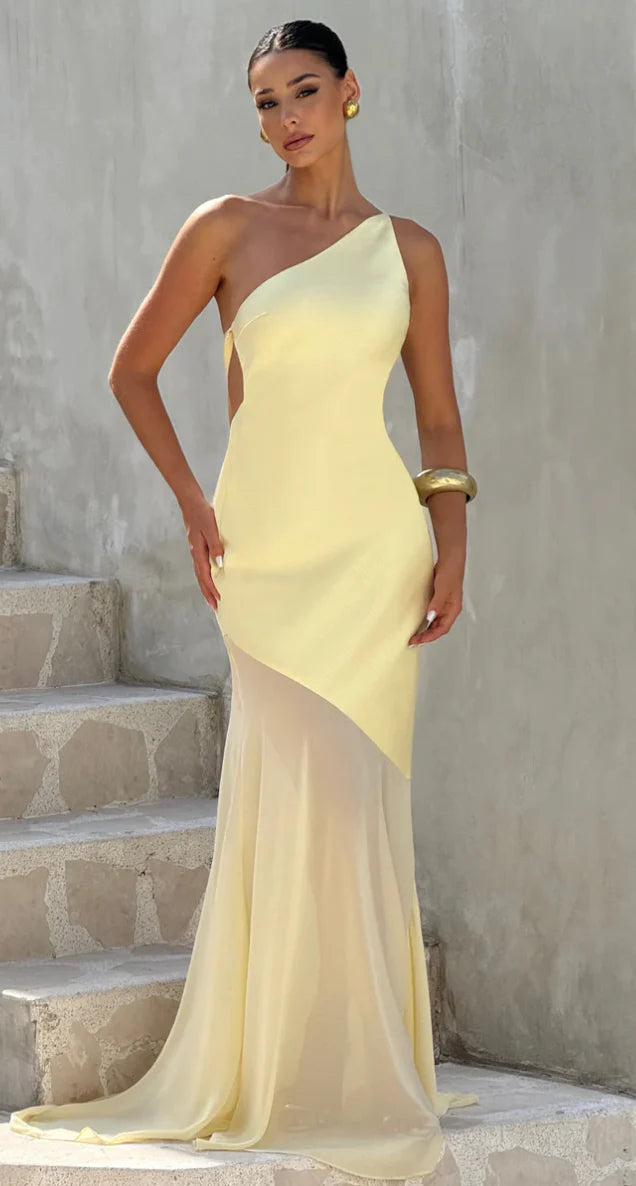 Exude timeless elegance in the Fable Gown in vibrant Lemon. This sophisticated maxi features an asymmetric neckline with internal gripper tape, adjustable straps, and an alluring open back design. The fitted silhouette through bust, waist and hips flows into a dramatic fishtail flare with train detail.