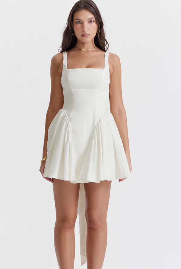 THE dress for warm spring and summer days, our 'Florianne' mini dress has a striking silhouette. It's cut from ivory cotton and the close fitting bodice is fitted with our incredible corsetry boning that turns to reveal an ultra low open back, complete with an oversized bow for feminine drama.