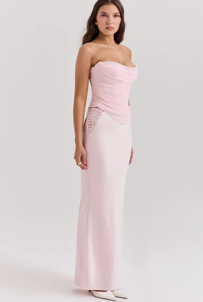 Our 'Giuliana' skirt is cut on the bias from a luxurious and lustrous stretch satin and has a slinky slip shape for a beautiful drape as it falls to the floor. Flowing naturally across the body, 'Giuliana' sits low on the waist and zips to the side. It has a lace up detailing to the side for a feminine finish. Don't miss our ' for a fairytale match.