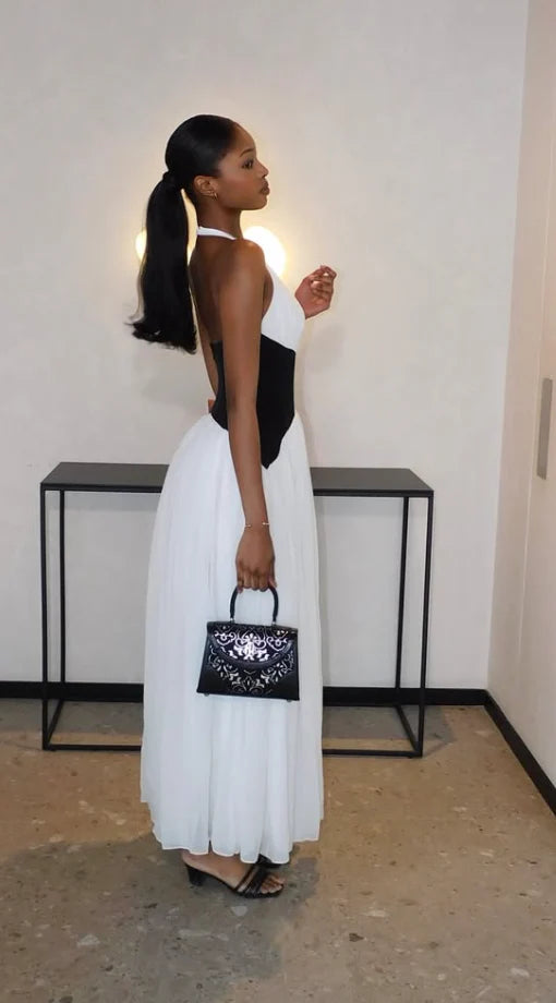 Dreamy and modern all at once; the Harlowe Contrast Corset Maxi Dress is a timeless standout. Crafted from luxurious premium chiffon fabric, this white maxi dress is delicately gathered across the halter neckline and below the corset for an effortless effect. The structured black corset waist creates a striking contrast while sculpting and emphasizing your figure. This dress is your go-to for making an unforgettable statement.