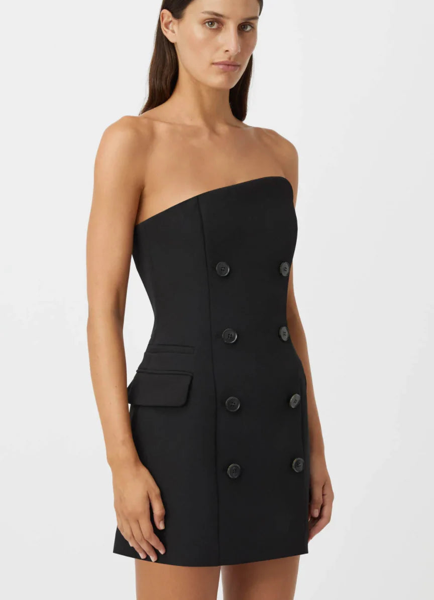 The Izola Tailored Mini Dress is a striking blend of modernity and classic sophistication, featuring a double-breasted strapless design that exudes confidence and allure. Meticulously crafted for a slim tailored fit, this dress enhances the silhouette with precision, while the boning in the bodice panels ensures a structured and fitted look.