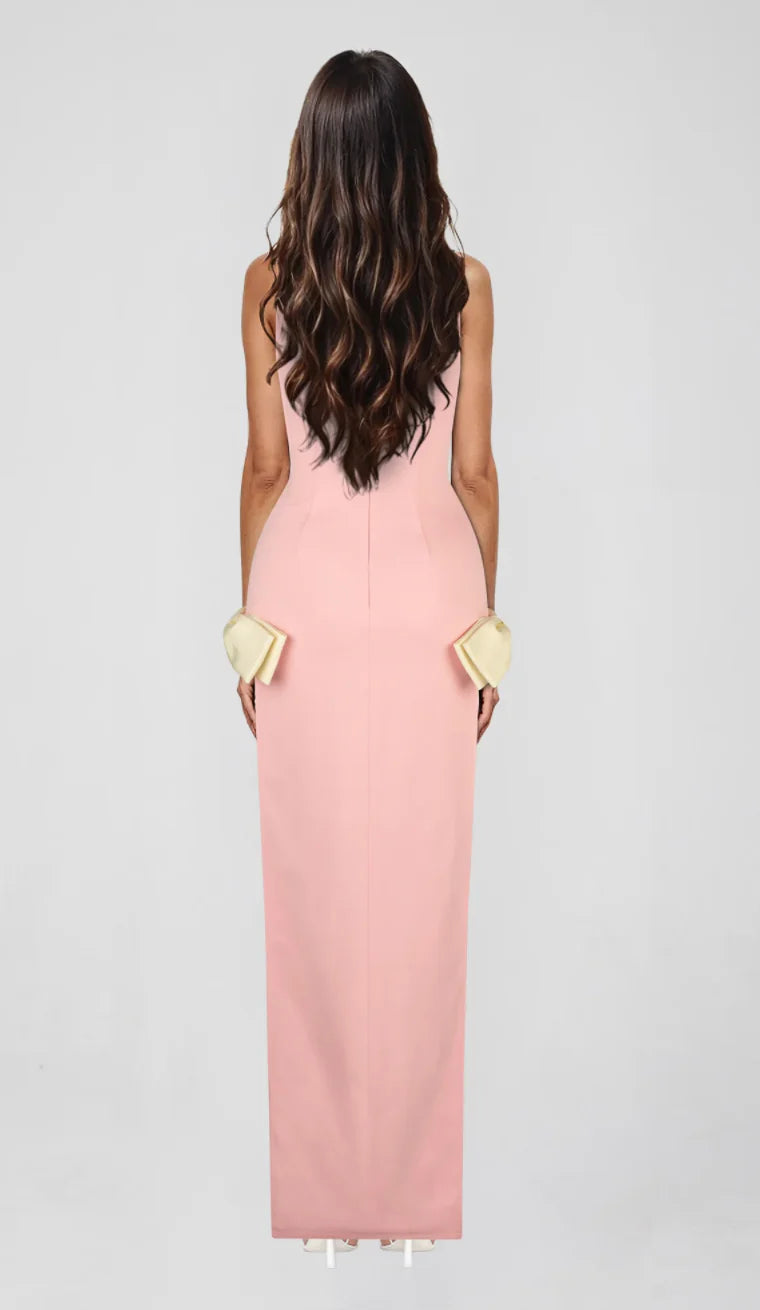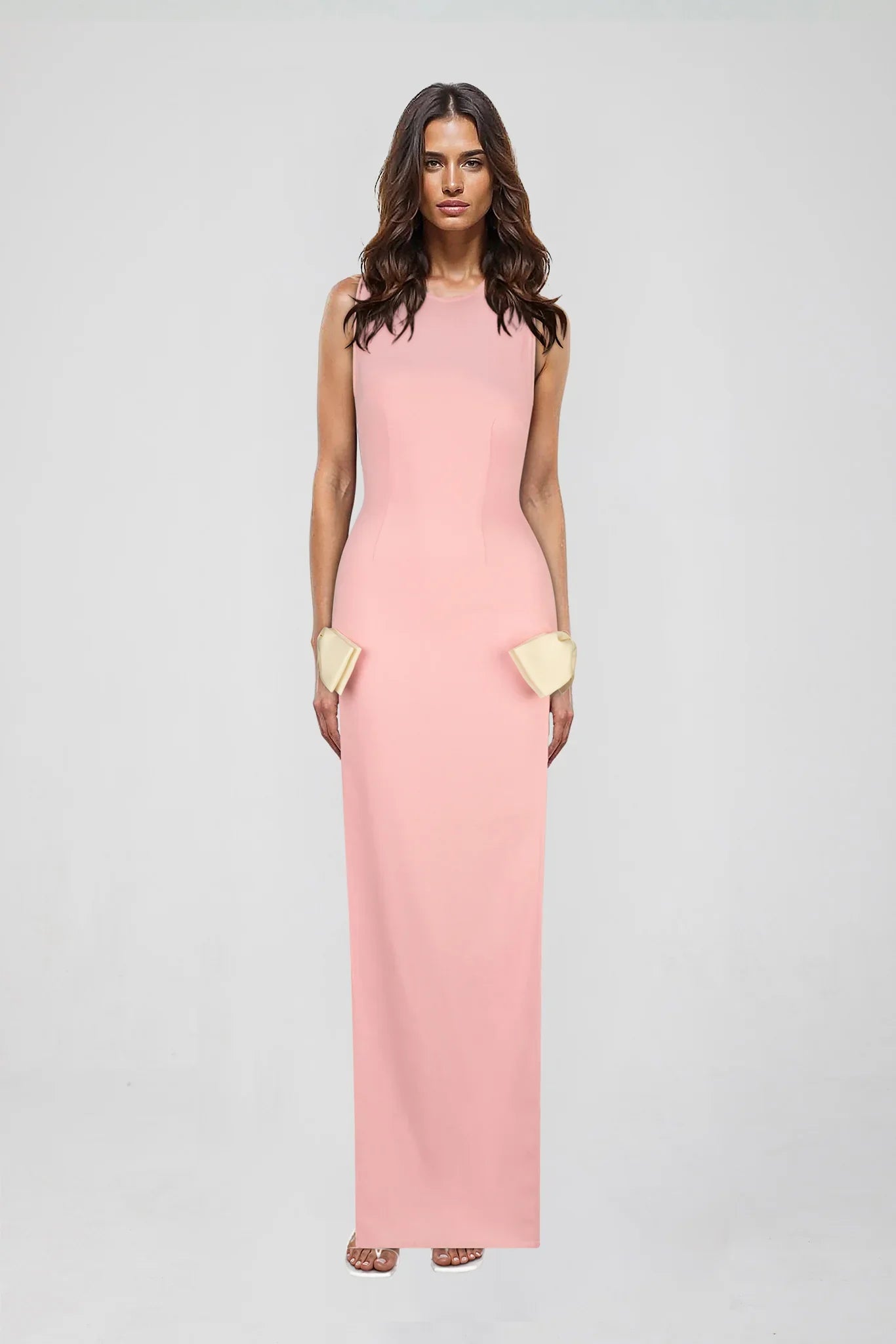The Jana Dress is a statement maxi dress featuring contrast satin bows at the side hip. A cut away side elevates a classic silhouette into a bold event style. An invisible centre back zip creates a sleek line for a seamless fit.