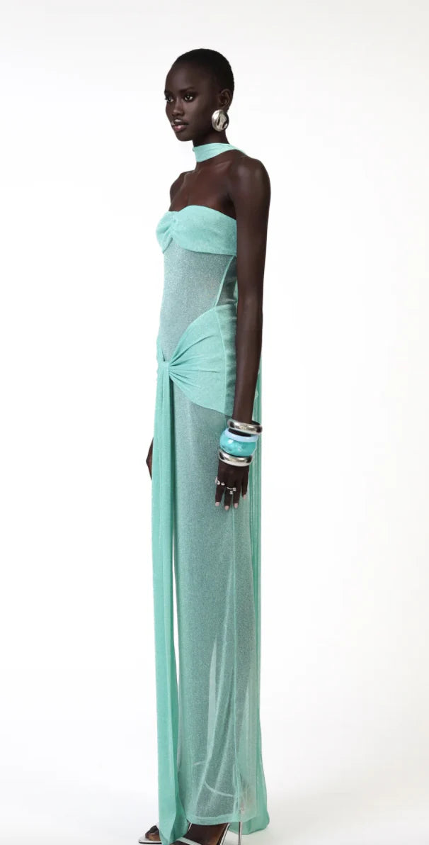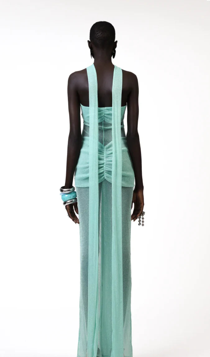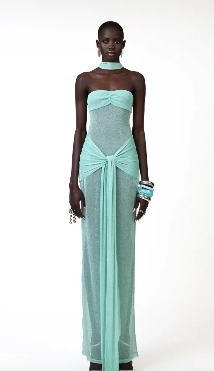 WITH ITS ALL-OVER GLITTERING TWINKLING SHEEN AND LUSH MINT COLOUR, OUR KESCA DRESS WILL ENSURE ALL EYES ARE ON YOU WHEN YOU WALK INTO THE ROOM. IT'S MADE FROM SUPER-SHEER MESH, RUCHED ACROSS THE BACK WITH A WRAP AROUND DETAIL TO ENSURE THE CLOSE FIT FLATTERINGLY HUGS YOUR CURVES. KESCA COMES WITH A SLIM SCARF DETAIL TO CREATE THE ILLUSION OF MODERN HALTER. THIS DRESS CALLS FOR CASCADING EARRINGS AND LOTS AND LOTS OF BANGLES. WARNING; ALL EYES WILL BE ON YOU.