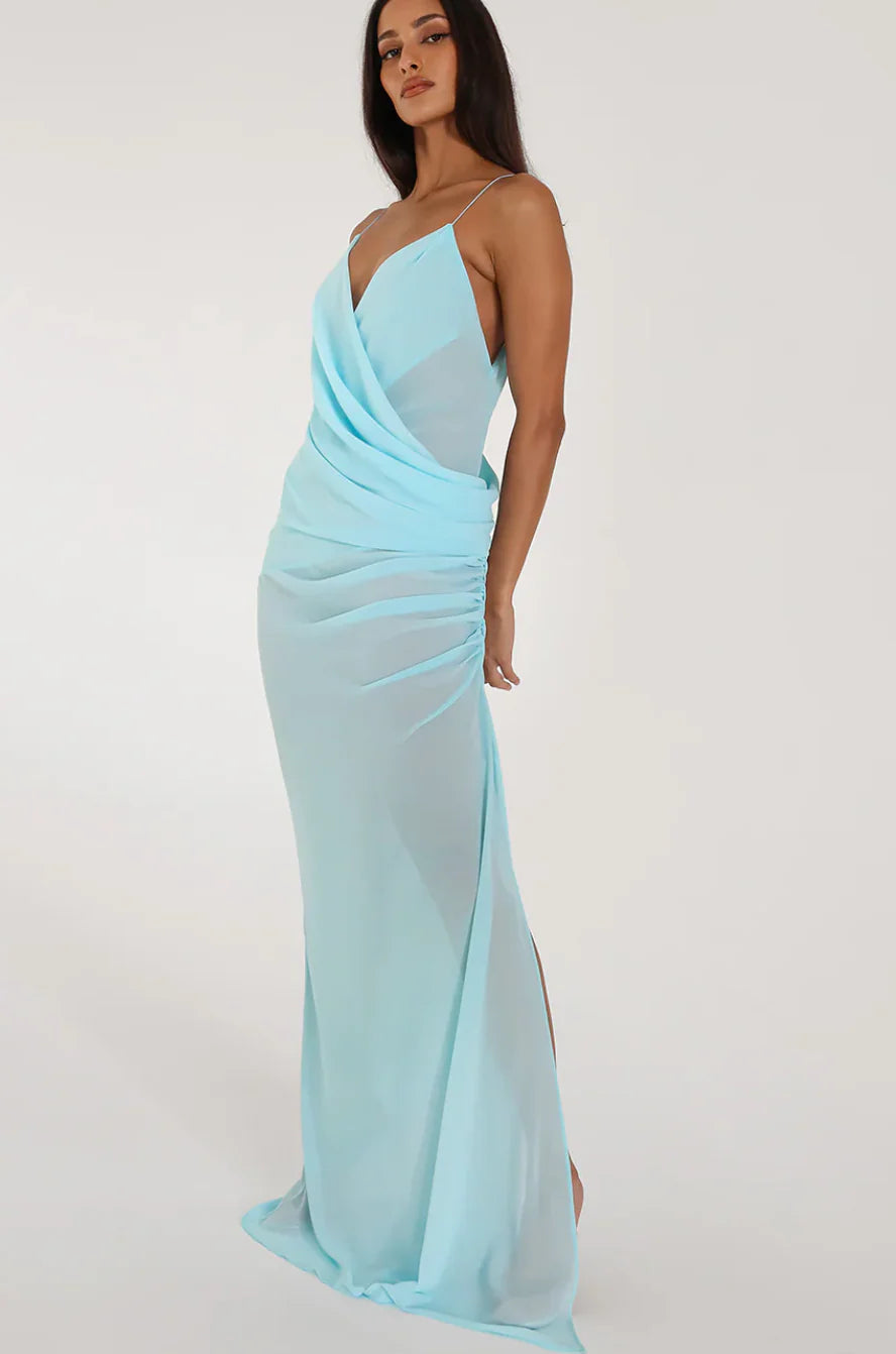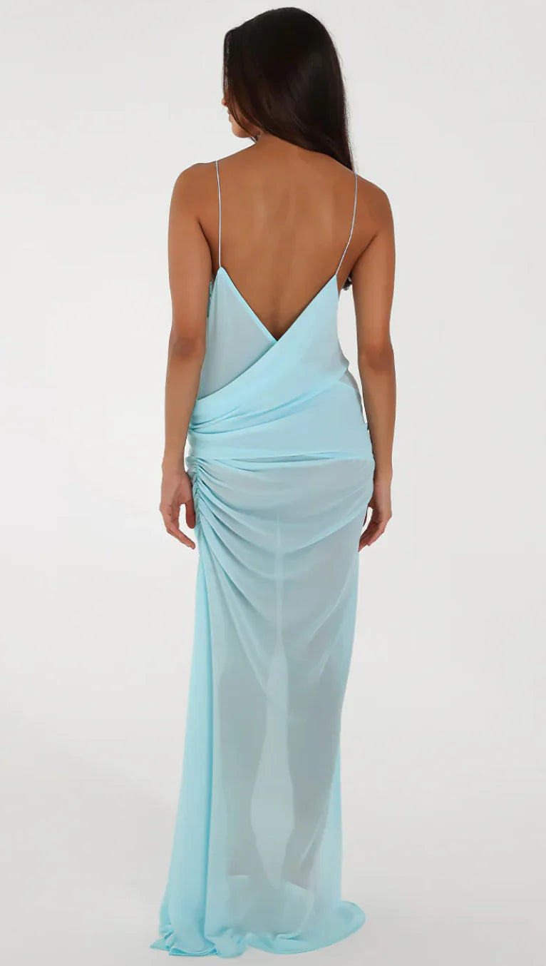 Carefully crafted for an effortless aesthetic. Magnolia is considered in design and craftsmanship for the illusion of effortless draping over the silhouette. Soft, flowing Georgette elegantly wraps across a fitted bodice, cowling just below the hip. The two pieces meet at an asymmetrical design line across the hip for playful coverage. Gathered side detail furthers the draped illusion, following the feminine form to enhance and flatter its shape. Suspended by cord straps is a deep V neckline, balanced and dipped at the back. Lightweight and sheer in nature, Magnolia exudes ethereal energy and grace.