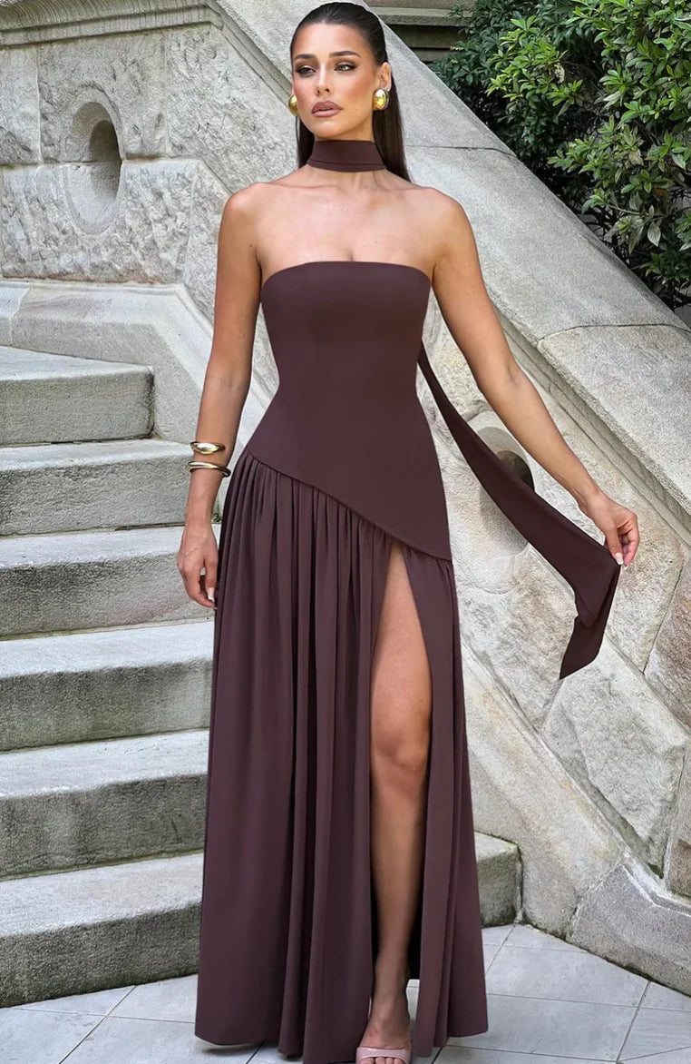 The Maliyah Maxi Dress in Plum Brown exudes timeless elegance with a modern twist. Crafted from a luxurious non-stretch crepe fabric, its strapless bodice features an asymmetrical hem that adds a unique, fashion-forward flair. The contrast Chiffon skirt flows beautifully, finishing with a daring thigh-high split that’s both bold and sophisticated. The lace-up back provides an adjustable, figure-flattering fit, ensuring you feel as confident as you look.