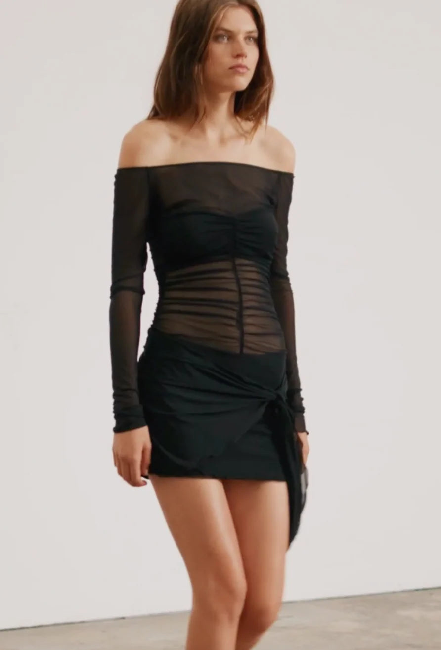 The Marina Long Sleeve Mini Dress is crafted from a soft mesh fabric in a fitted and flattering silhouette. The mini features an off the shoulder neckline, in-built bust lining, ruched front and back centre seam and a double lined sarong style mini skirt. Dress is finished with lettuce edges.