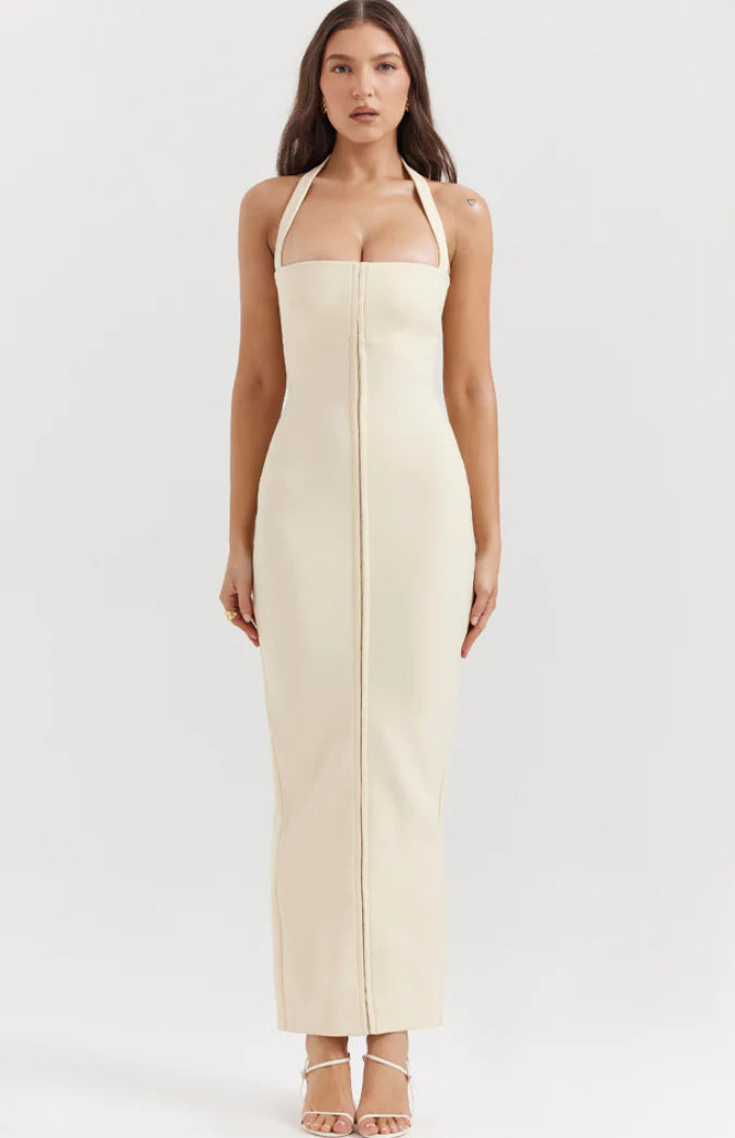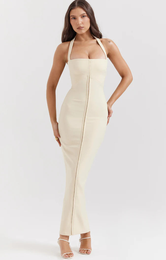 Our 'Mia' maxi dress is cut for a figure hugging fit that beautifully showcases the female form. Cut from an ecru crepe and woven with stretch for extra comfort, it has decorative detailing through the front and a corseted bodice to cinch the waist and lift your bust.