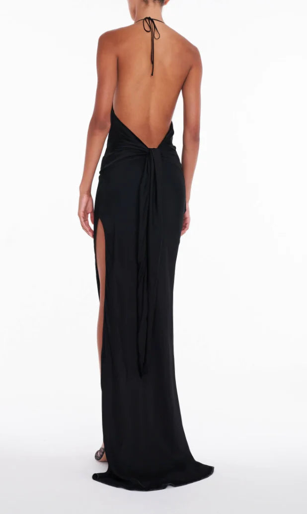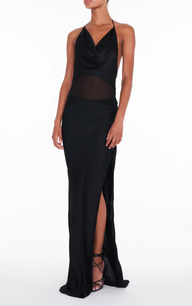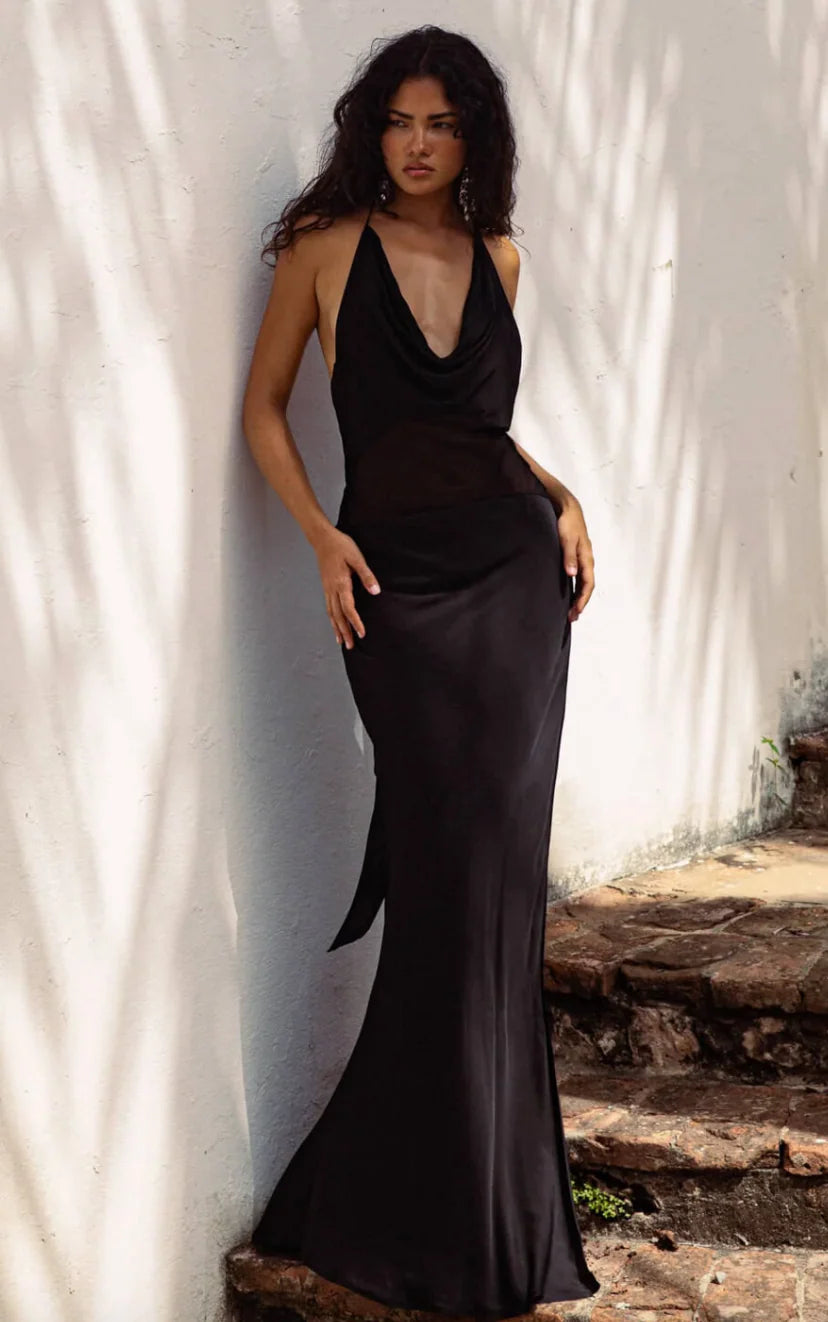 Introducing the Orchid dress, a timeless wardrobe icon that radiates dark glamour. With a flawless, fluid silhouette that sweeps gracefully to the floor and skims the body with the utmost chic, it's crafted from contrasting, tactile panels of luxurious satin and semi-sheer viscose. The daringly cut back is finished with knotted detailing and delicate ties while the gently plunging cowl and slit skirt perfectly balance elegant sophistication with an air of seduction.