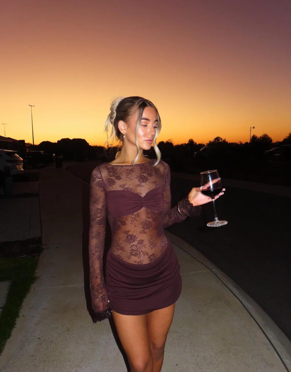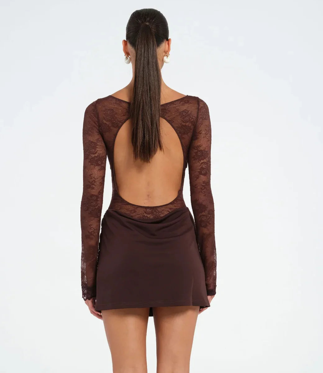 The Yana Lace Mini Dress features a long sleeve stretch lace bodysuit with an open back and internal bra shelf at front bust. The cowl mini skirt adds a touch of elegance to the front of the bodysuit. Perfect for a night out or special occasion, the dress is designed to make a statement with its understated allure.