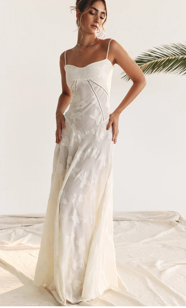 'Seren' is perhaps our most romantic dress yet and we're loving the corset inspired lace up back for a vintage feel. It's cut from a luxurious textured Jacquard in a vintage cream, embellished with floral blooms. 'Seren' features a built in bra that's underwired for a flattering bust with delicate rouleau shoulder straps.
