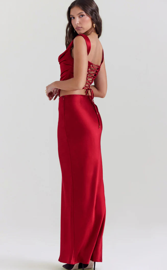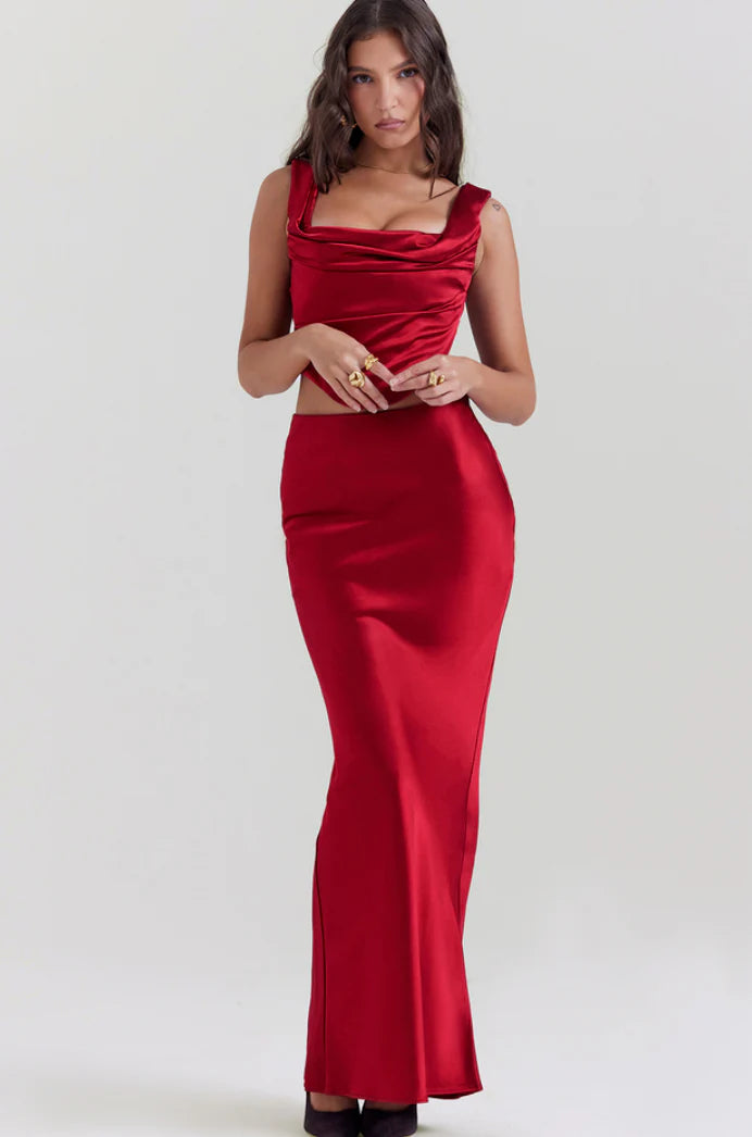The simple cut of our 'Sydel' maxi skirt makes it a favourite wardrobe staple. Beautifully cut on the bias, it highlights the fluid drape of the luxurious ruby satin that skims over the hips.