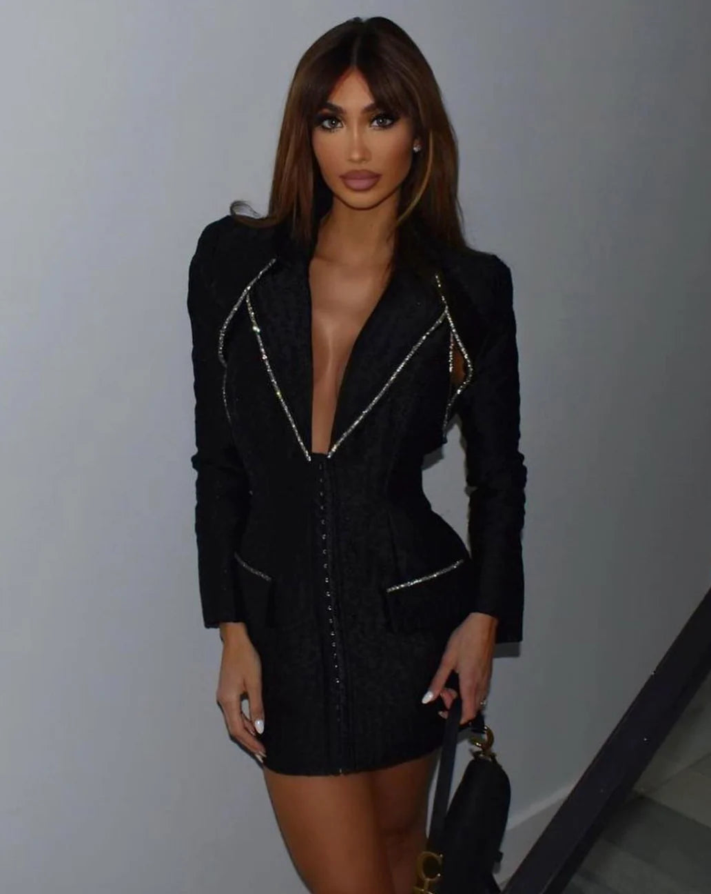 This Teri Blazer Dress is expertly fitted for a sophisticated and chic look. The bolero jacket is seamlessly attached to create the perfect all in one dress meets blazer set style. Crafted from a luxuriously textured fabrication whilst adding a touch of glamour with her diamantee trim, the Teri is an elevated and edgy style that'll be sure to make a daring statement at your next special occasion.