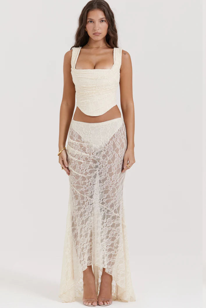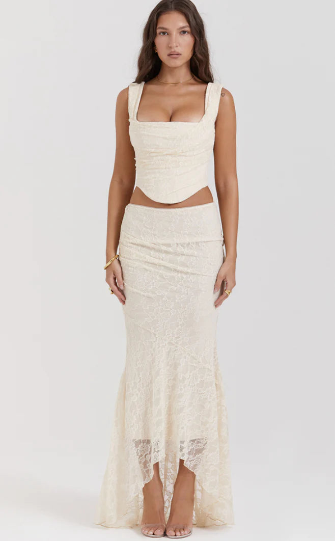 'Therese' maxi set perfectly captures elegant romance. Cut from a gorgeous vintage cream stretch lace that's swirling with pretty florals, it sits low on the waist and skims over the hips. The skirt falls to a fluted asymmetric hem that dips to a flattering floor-grazing length at the back.