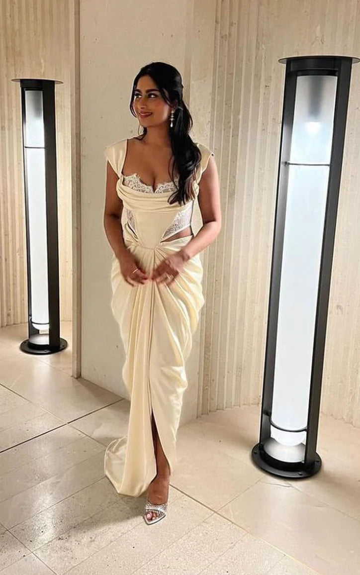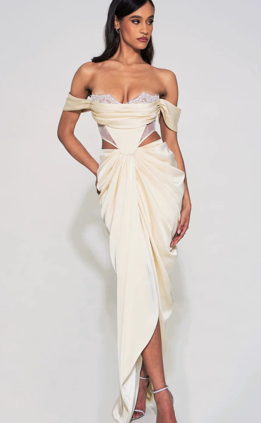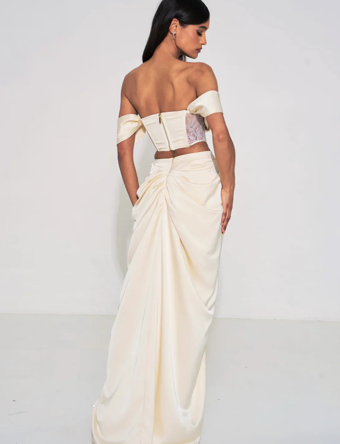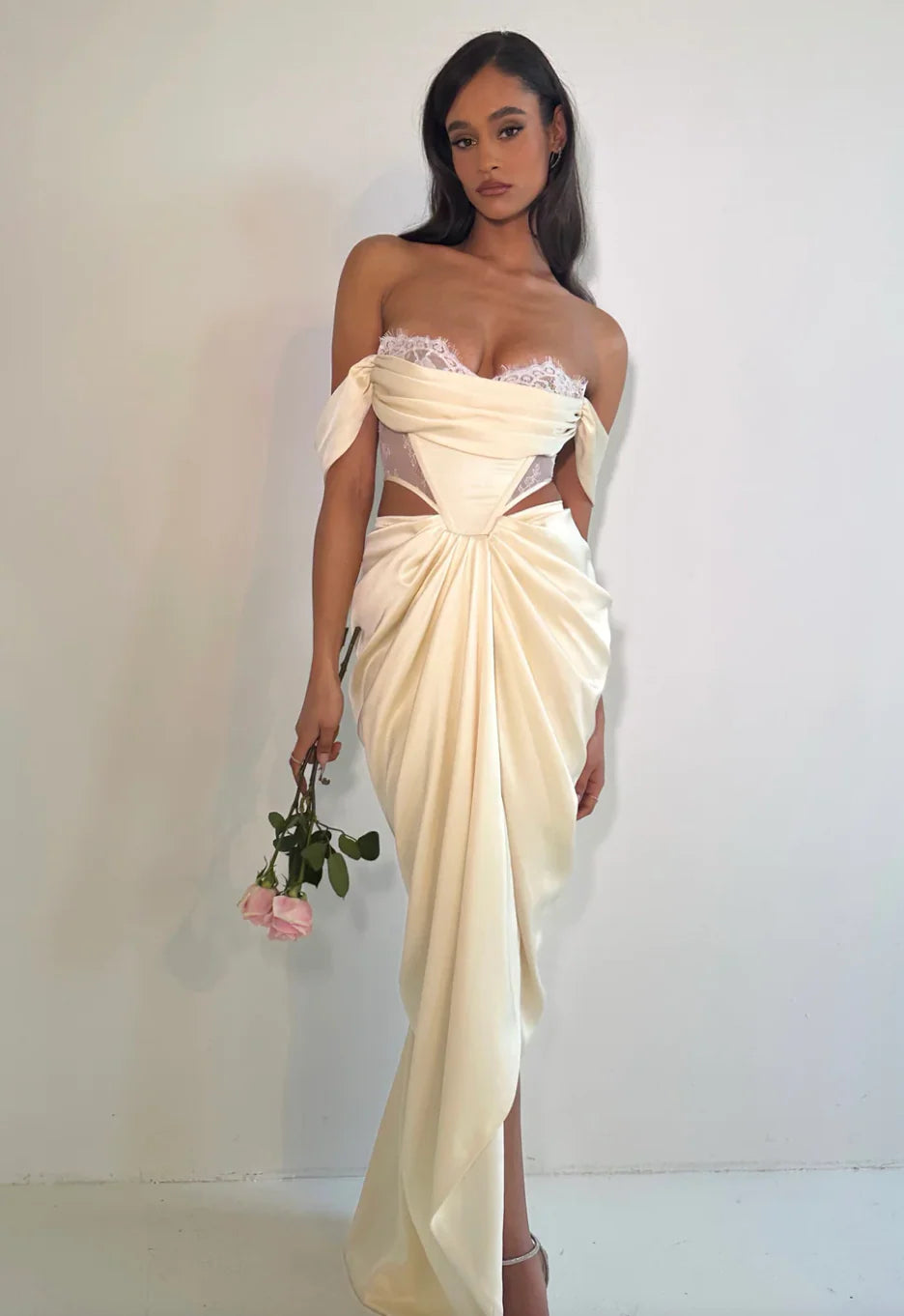 Umbrielle Pearl White Lace Satin Corset Off Shoulder Gown