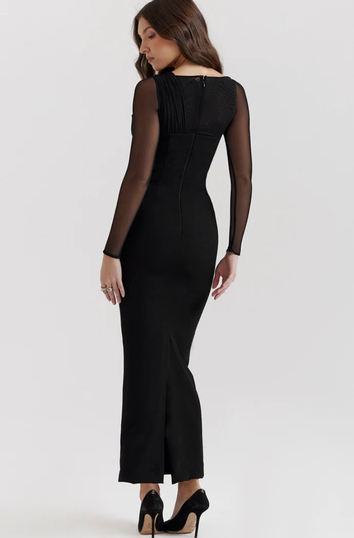 From the timeless black hue to the sweeping shoulder strap, our 'Zahra' maxi dress ensures a glamorous entrance when you enter the party. It's cut from a sustainable stretch crepe with a hint of mesh for soft feminine vibes and a daring plunge neckline.